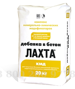 ЛАХТА КМД сухая смесь желто-серого или серого цвета, представляющая собой комплекс минерально-химических модификаторов. ЛАХТА® КМД предназначена для использования в различных типах бетонов на портландцементе, напрягающих, тампонажных цементах: товарные бетоны различных марок (особо тяжелые, тяжелые, легкие, особо легкие); дисперсно-армированные (фибробетоны); гидротехнический бетон; напрягающий бетон и т. д. Применение ЛАХТА® КМД позволяет: получать высокопрочные бетоны; уменьшить время распалубки бетона и ускорить ввод в эксплуатацию бетонных и железобетонных конструкций; повысить марку бетонов по водонепроницаемости на 3 ступени и более;